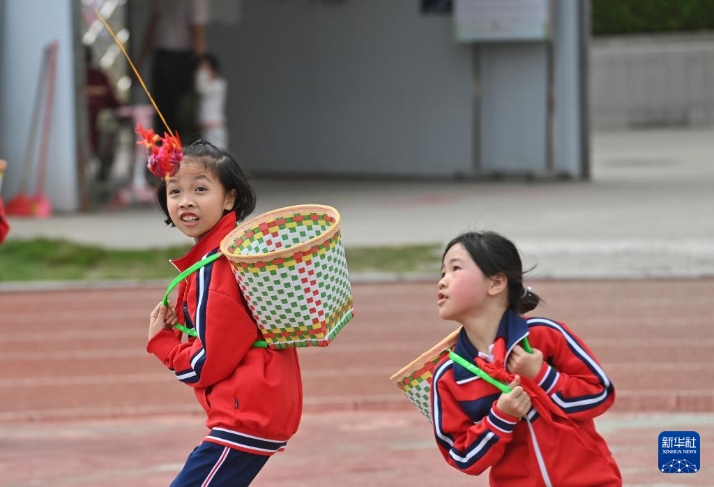 在梧州市長洲區龍平小學,學生們在陽光大課間跳竹竿舞(2024年3月26日攝)。