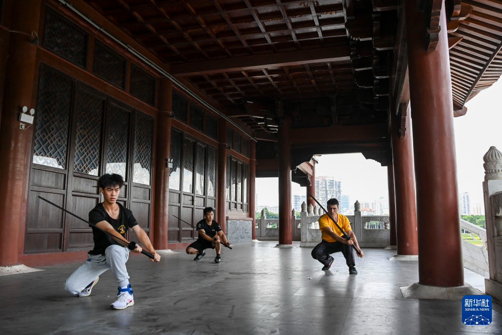 莫小龍(中)和武術同仁在南寧暢游閣練習苗刀(7月6日攝)。新華社記者 金皓原 攝