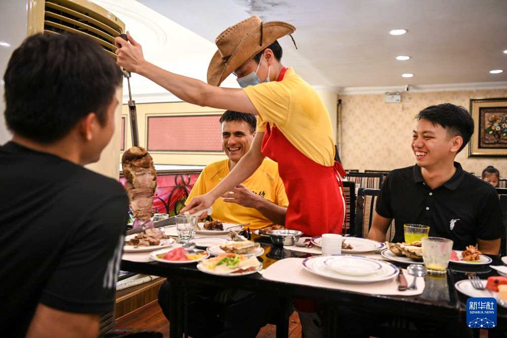 莫小龍(左二)和友人在南寧市一家餐廳品嘗巴西烤肉(7月6日攝)。新華社記者 曹祎銘 攝