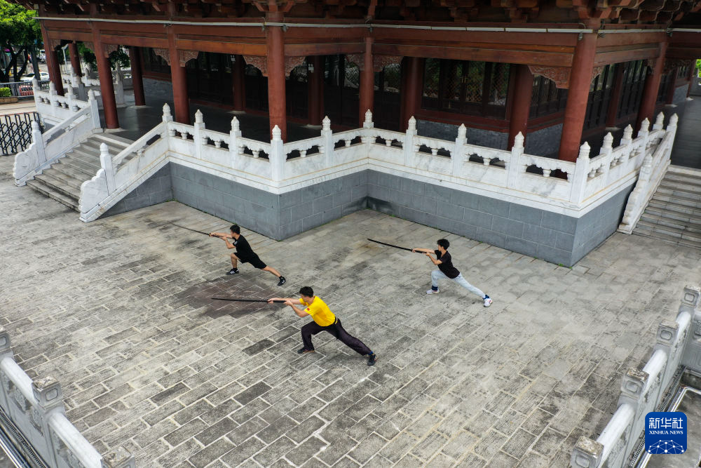 莫小龍(前)和武術同仁在南寧暢游閣練習苗刀(7月6日攝,無人機照片)。新華社記者 曹祎銘 攝