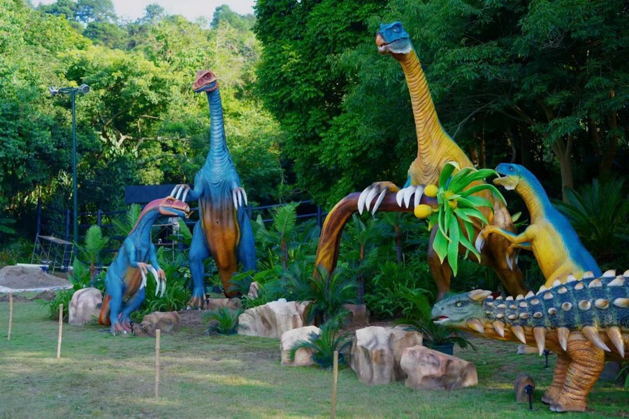 往絢蘭花田方向走100米左右,按照指引,右轉下臺階到達蘭園大草坪,我們就來到了期盼已久的恐龍世界!現場有近60只體形碩大、形態各異、栩栩如生的“恐龍”,仿佛穿越侏羅紀公園!