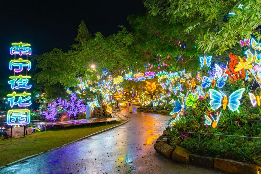 夜幕降臨,青秀山依然熱鬧非凡。華燈初上,光影變幻,穿梭在青山綠水間,可盡情拍照打卡游玩。為豐富景區的文化旅游內容,塑造城市夜間旅游特色,青秀山風景區于2024年8月1日—11月17日在青秀山北門區:蘭園、蔭生植物園、桂花園區域舉辦“南寧夜花園”活動,為廣大市民游客呈現一場藝術與色彩完美融合的視聽盛宴。