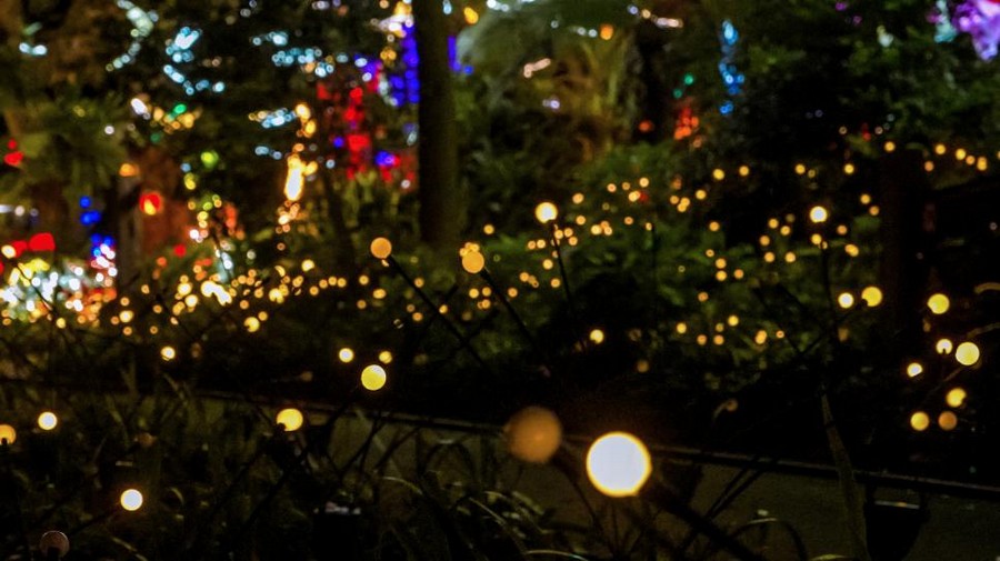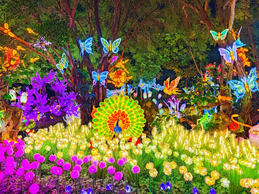 出花園市集,往金杉湖方向走,靠近蘭園一側前行,到達昆蟲世界,大量造型各異、形態生動的“放大版”昆蟲燈光造型,親臨一場仲夏花蟲的視覺盛宴。