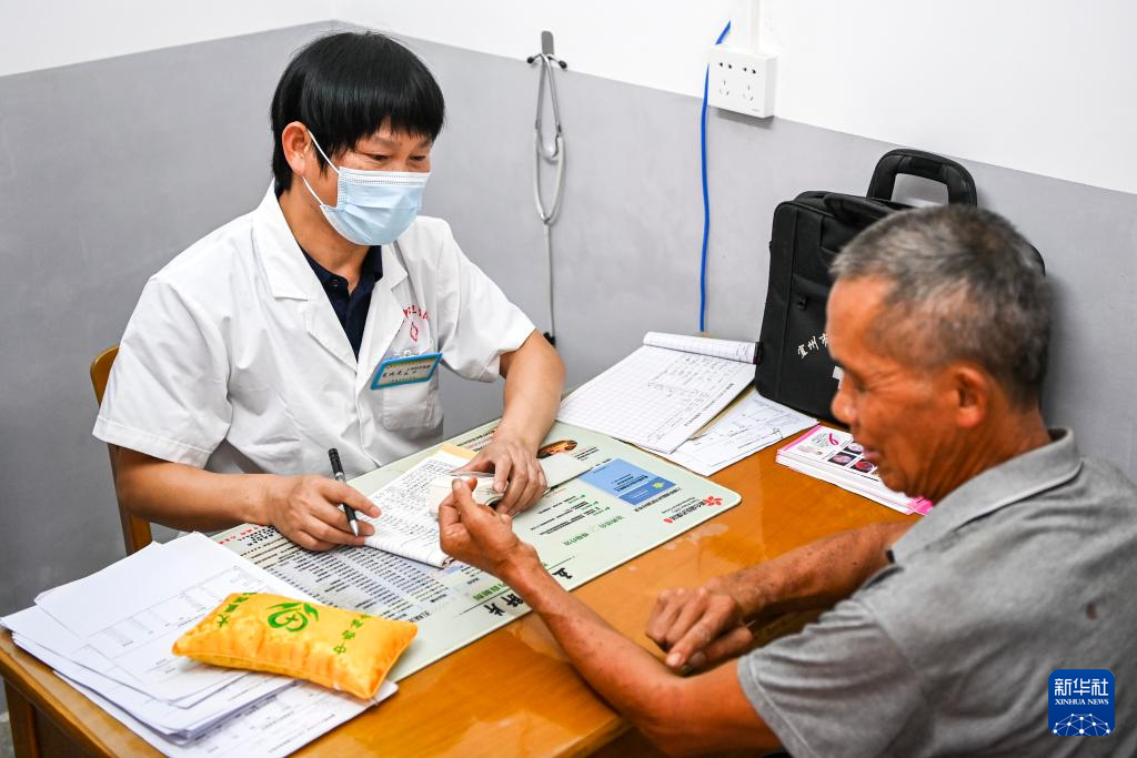 8月15日,在廣西河池市宜州區德勝鎮上坪村衛生室,鄉村醫生葛現克(左)與患者交流。