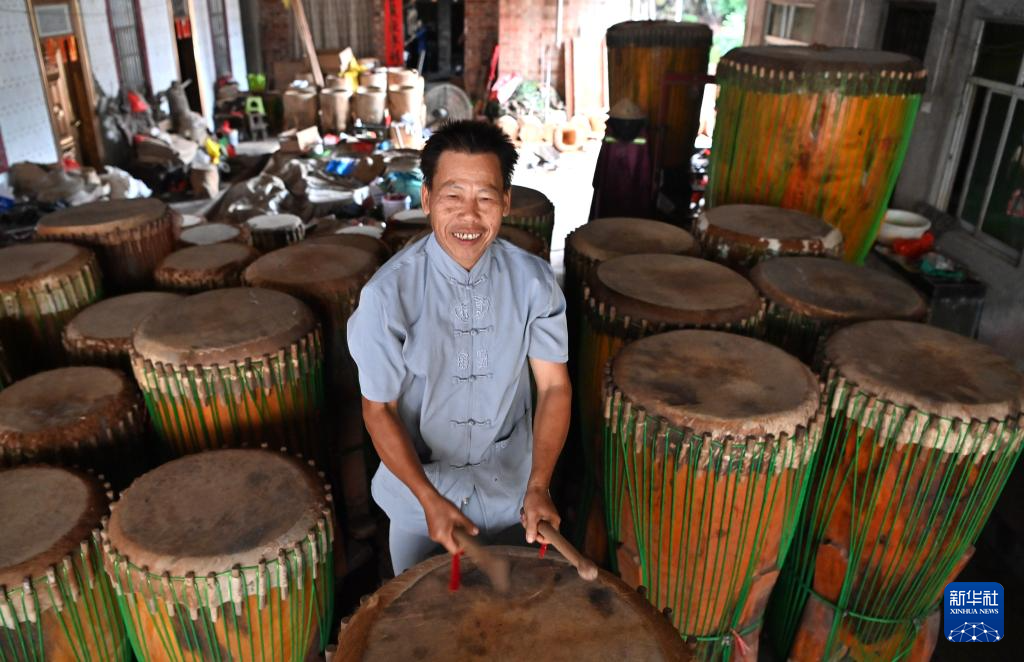 “我八九歲開始跟著爺爺學鼓,40多年來制作了大大小小的鼓2000多面。如今,幾個孫子也在放假時跟著學做鼓。我相信,煙墩大鼓的制作技藝一定會一代代傳下去的?!睆V西靈山縣煙墩鎮六加村委沙塘村村民施紹漢說。