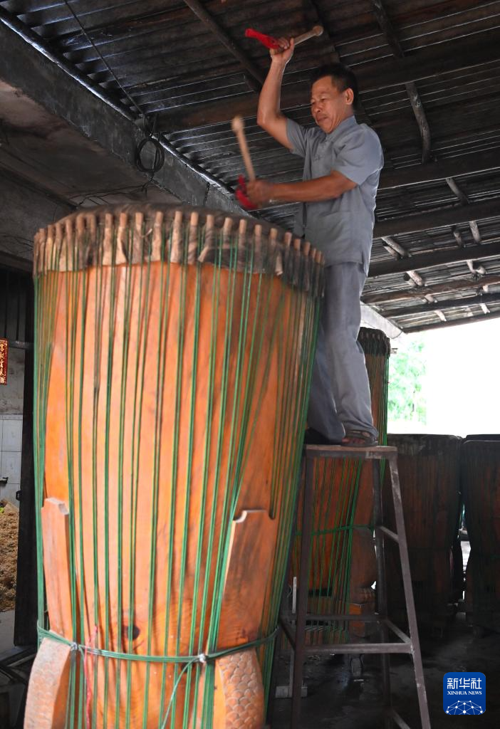 1964年出生的施紹漢是家里第25代煙墩大鼓手藝人,也是廣西壯族自治區級非遺傳承人。據他介紹,煙墩大鼓歷來都是純手工制作,做一面2.5米高的大鼓需25天左右。