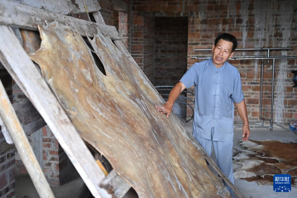 施紹漢在查看晾曬的牛皮,準備制作煙墩大鼓(8月15日攝)。