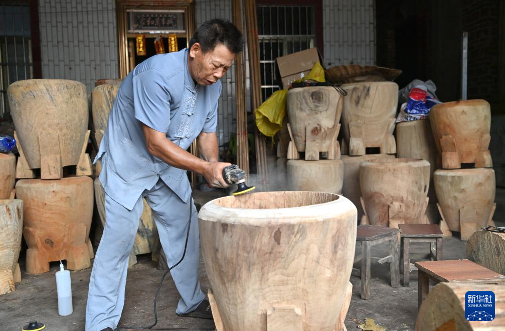 施紹漢在打磨木頭,制作煙墩大鼓(8月15日攝)。