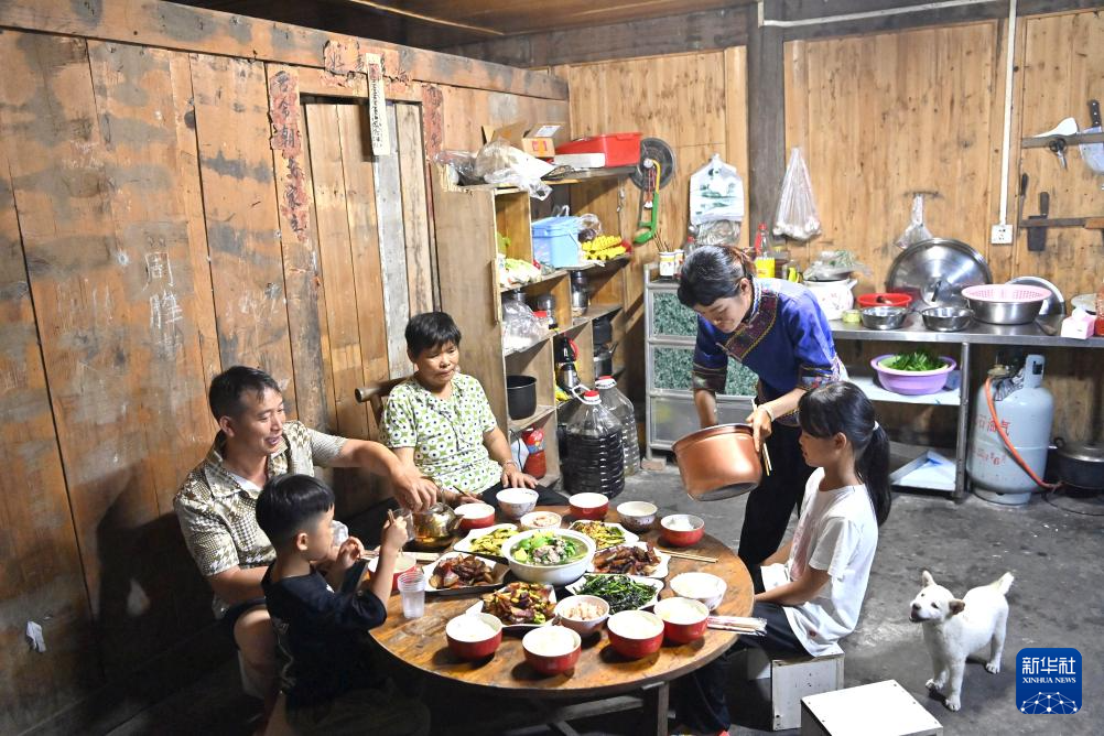 在廣西河池市南丹縣里湖瑤族鄉八雅村巴哈屯,村民李軍一家在吃晚飯(8月28日攝)。