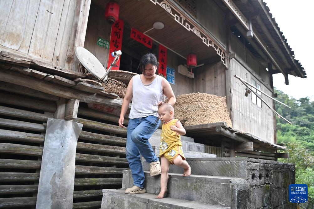 在廣西河池市南丹縣里湖瑤族鄉八雅村巴哈屯,一名村民帶著孩子走出家門(8月28日攝)。