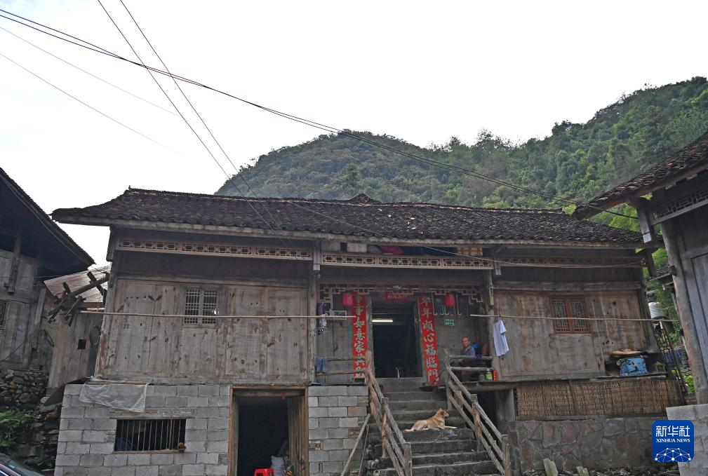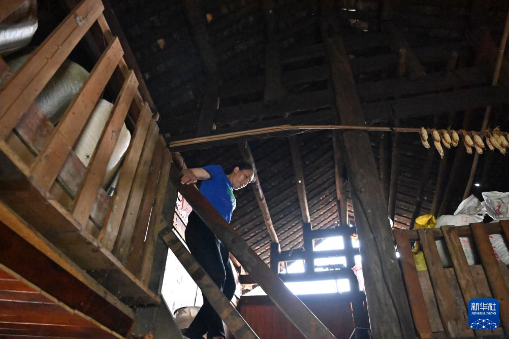 在廣西河池市南丹縣里湖瑤族鄉八雅村巴哈屯,村民從存放糧食的二樓下來(8月28日攝)。