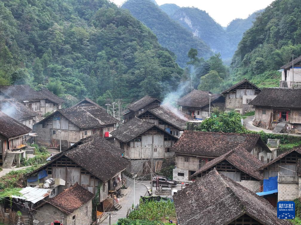 大山深處的廣西河池市南丹縣里湖瑤族鄉八雅村巴哈屯炊煙裊裊(8月28日攝,無人機照片)。