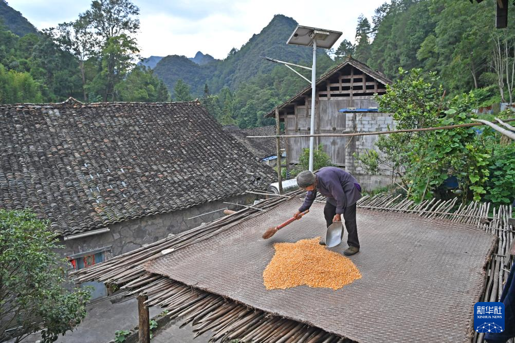 在廣西河池市南丹縣里湖瑤族鄉八雅村巴哈屯,一位村民在收晾曬在自家門前的玉米(8月28日攝)。