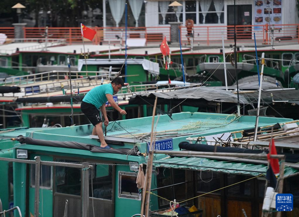 9月6日,在廣西北海市僑港鎮電建漁港碼頭,漁民在加固船只,準備撤離上岸。