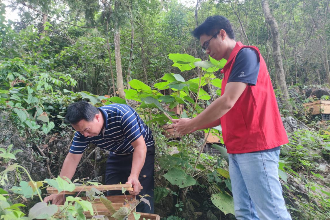 金秋九月,蜂蜜飄香。在廣西來賓市忻城縣遂意鄉弄堯村生態蜜園里,一個個蜂箱錯落有致地排列,成群結隊的小蜜蜂進進出出,駐村工作隊員正在查看蜜蜂養殖情況。