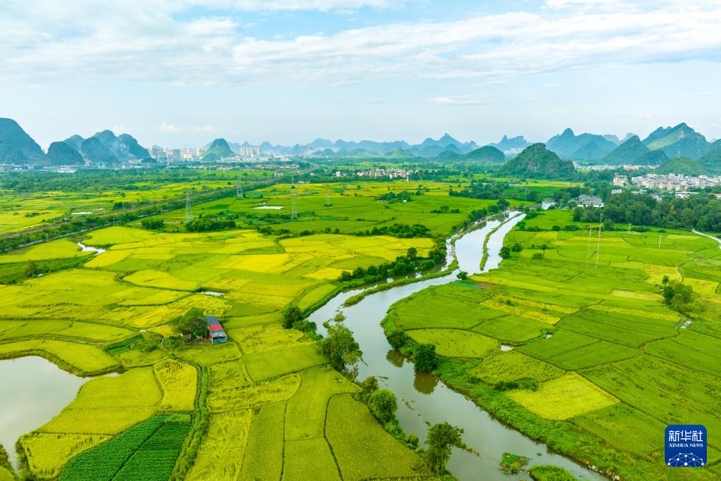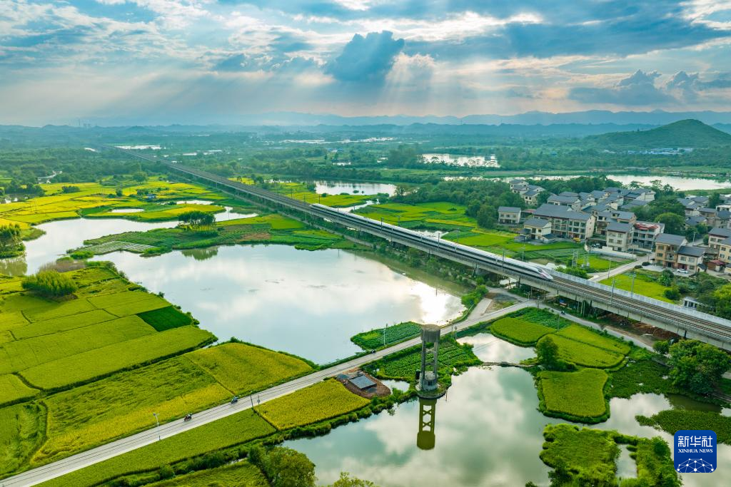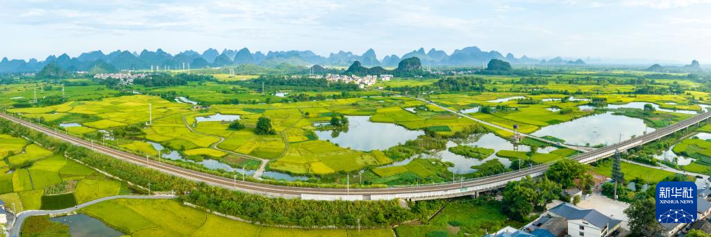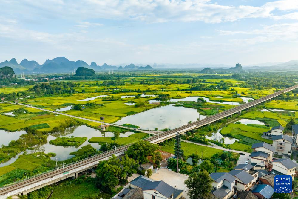 2024年9月16日,在廣西桂林市臨桂區四塘鎮太平村,濕地、田園、村莊、鐵路、晚霞相映成趣,一幅秀美的鄉村秋色畫卷展現在眼前。近年來,當地持續推進農村環境綜合整治,大力發展農村經濟,農村處處呈現出產業興、鄉村美的新畫卷。