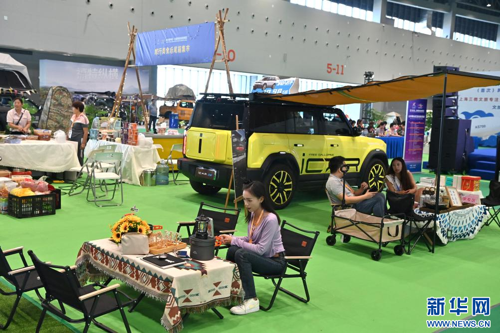 9月26日,觀眾在第21屆中國—東盟博覽會旅游展區體驗戶外露營用品。