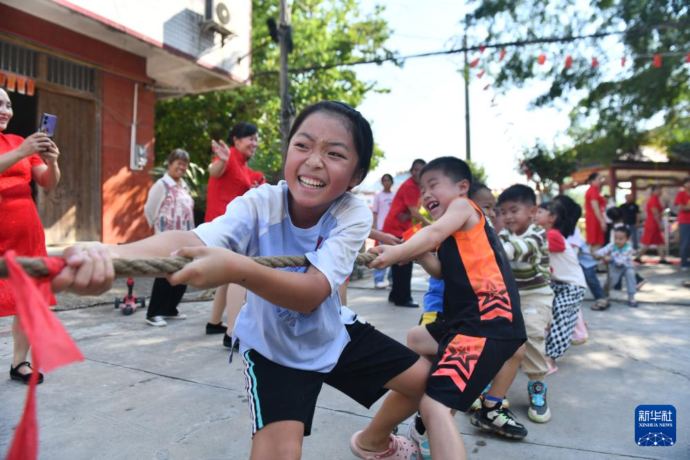 國慶假期,廣西柳州市柳江區鄉村的孩子們用蕩秋千、拔河、打陀螺、跳繩等方式娛樂健身,享受快樂假期,強健體魄。