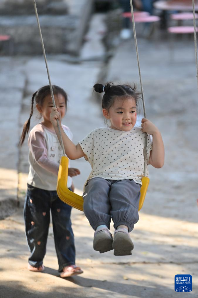 柳州市柳江區三都鎮白見村板朝屯的小朋友們在蕩秋千(10月6日攝)。