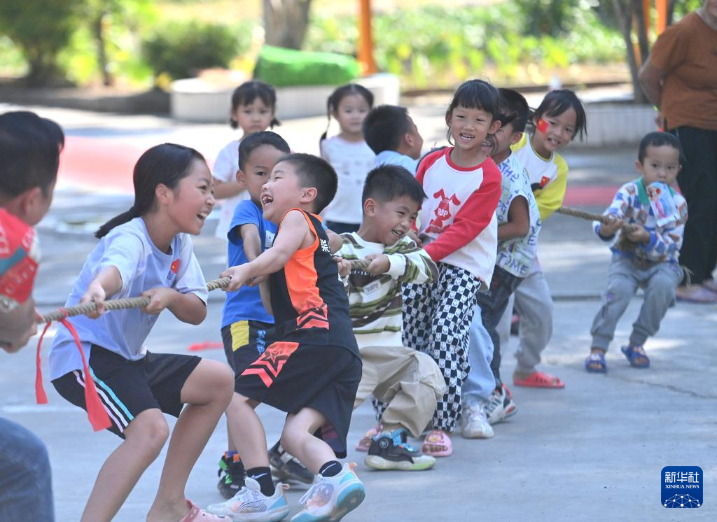 柳州市柳江區三都鎮白見村板朝屯的小朋友們在進行拔河比賽(10月6日攝)。