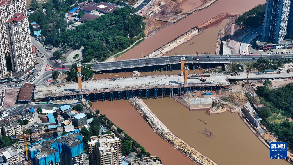 這是正在建設中的平陸運河沙井欽江大橋,旁邊的是臨時保通橋(10月11日攝,無人機照片)。