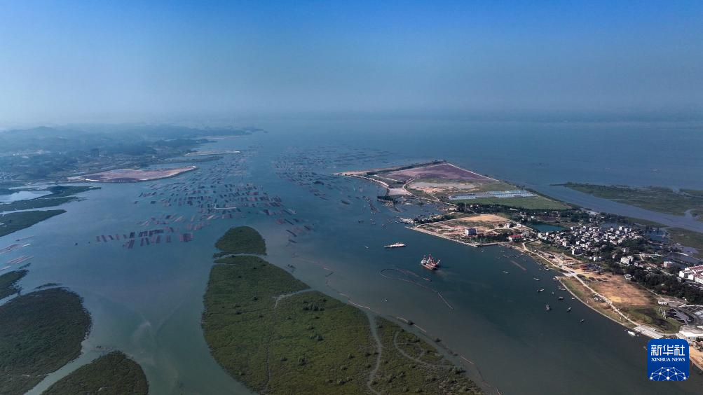 施工隊伍正在建設流經欽州市區的平陸運河航道(10月11日攝,無人機照片)。