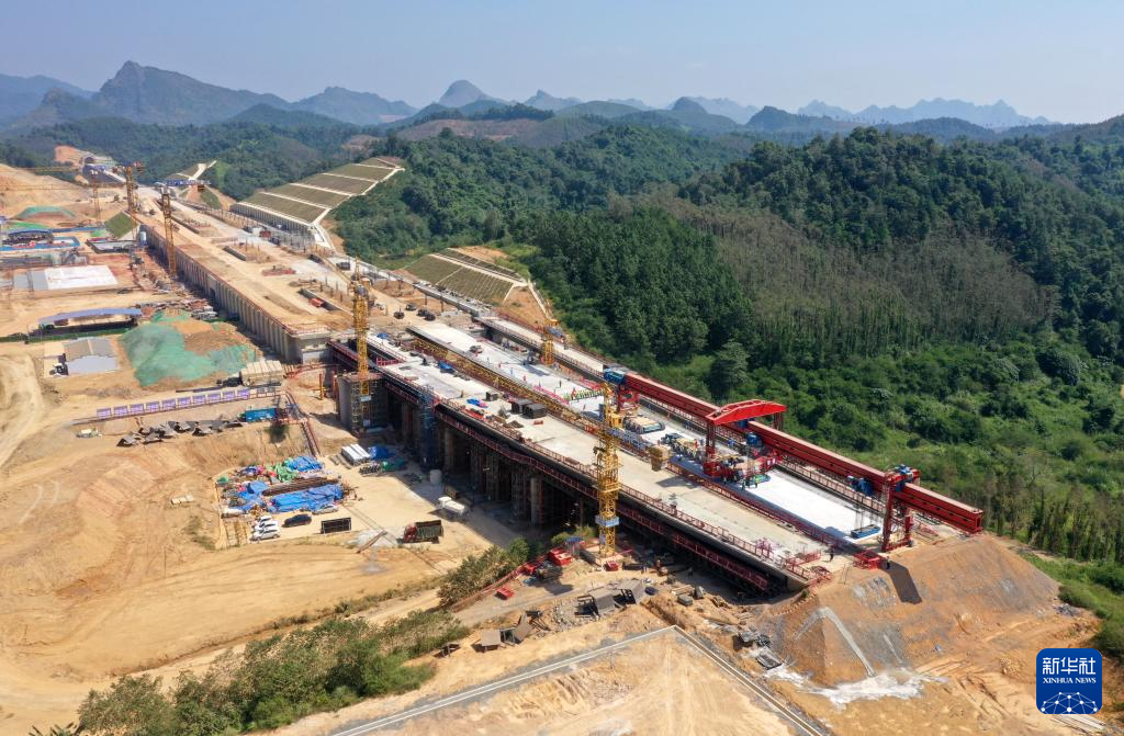 10月11日,在南憑高鐵憑祥東站出站五線大橋上,中鐵一局工人在施工鋪架箱梁。