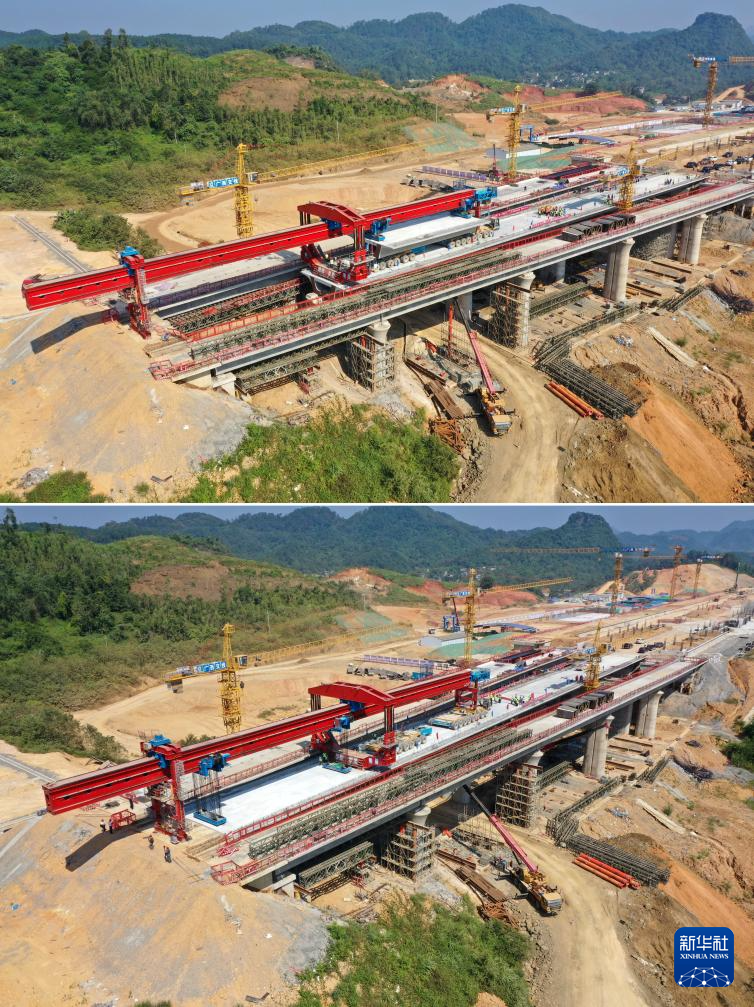 拼版照片:這是南憑高鐵憑祥東站出站五線大橋貫通前(上圖)后(下圖)場景(10月11日攝,無人機照片)。