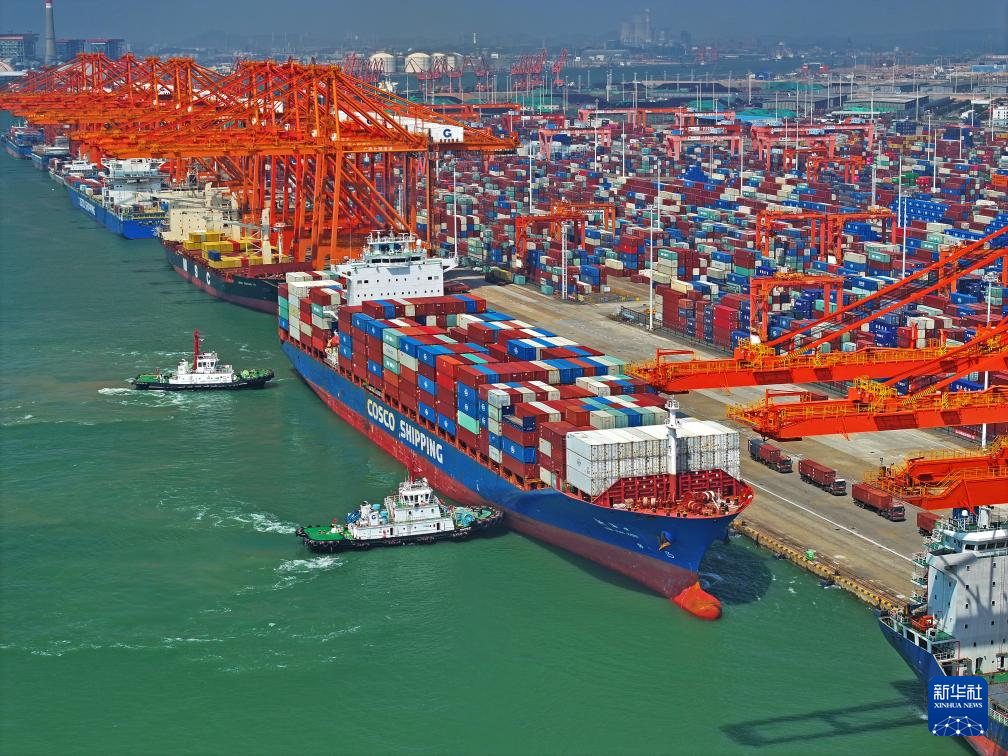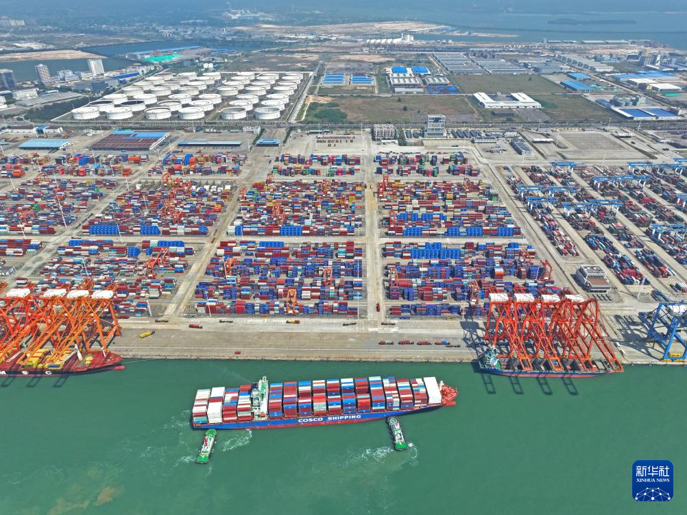 10月13日,一艘集裝箱貨輪在廣西北部灣港欽州港區碼頭靠泊(無人機照片)。