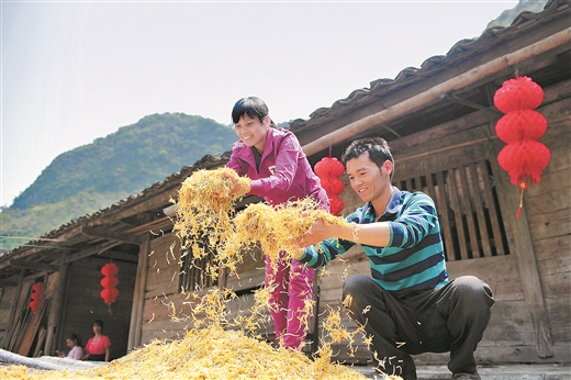 “縣里、鄉里經常來人,講政策、給補助。我和幾個村民決心先行試種?!彼{啟紅說。2014年時,他家的金銀花畝產已經達到200多公斤,率先脫貧。如今,他是當地金銀花專業合作社負責人,今年,合作社銷售干花達3噸,銷售額超200萬元。