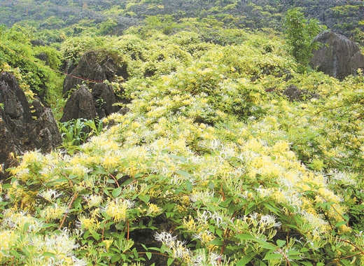 以微薄的水汽為飲,以貧土為食,金銀花,頑強地伸展著藤蔓,于絕境處覓生機。由此,一片又一片的石漠化逐步褪去,曾經貧瘠的山坡換了新顏。