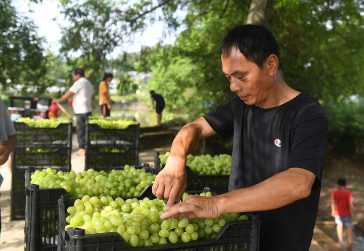 在廣西全州縣才灣鎮毛竹山村,當地村民在分揀剛剛收摘的葡萄。新華社記者陸波岸攝