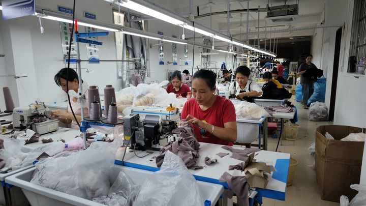 在丹竹鎮丹竹村的一家運動服飾廠,工人們正在加工服裝。新華每日電訊記者 楊馳 攝