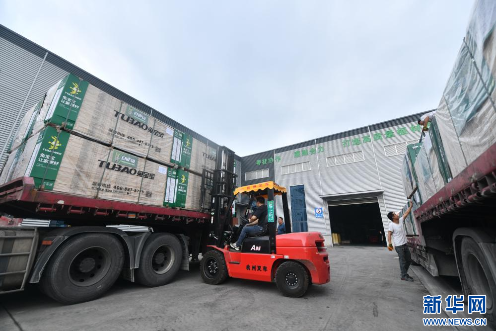在廣西融水苗族自治縣粵桂協作產業園一家林木加工企業,工人在裝載產品(10月18日攝)。