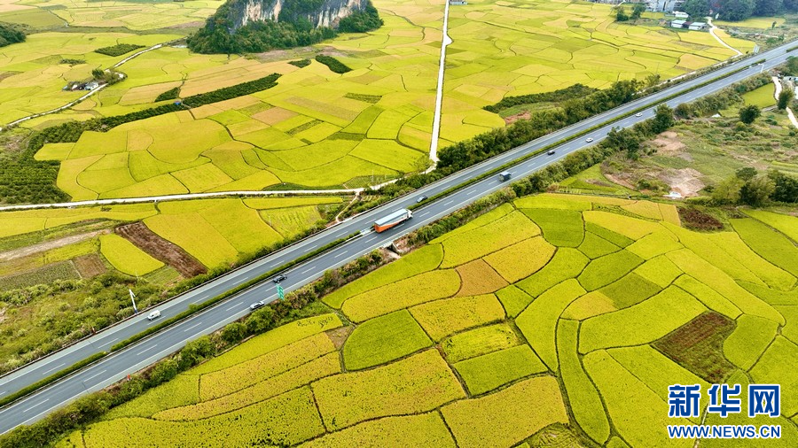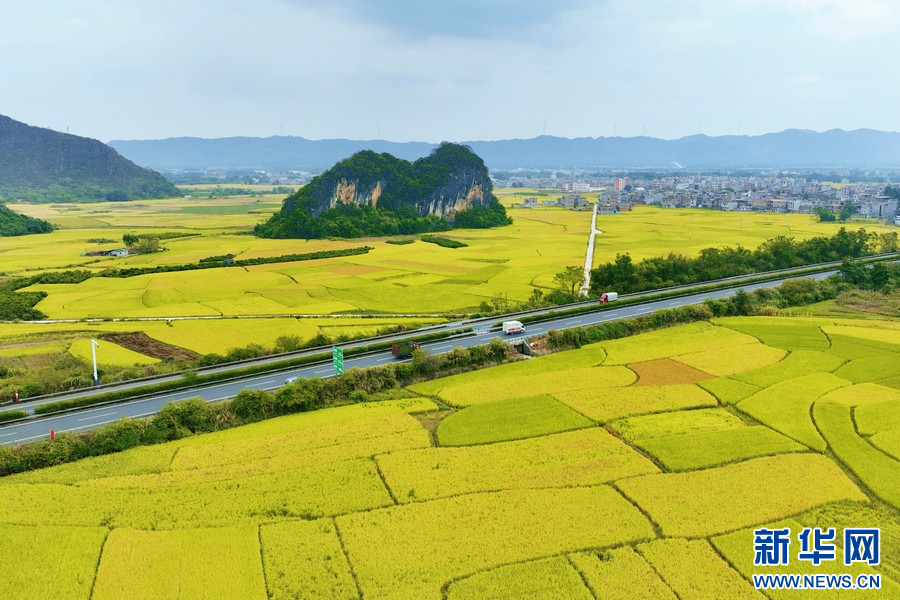 近日,廣西賀州市鐘山縣回龍鎮的水稻豐收在即,金黃的稻田、錯落有致的村莊與遠處的高速路交相輝映,繪就一幅金秋豐收畫卷。(鄧靜子 吳桂行)