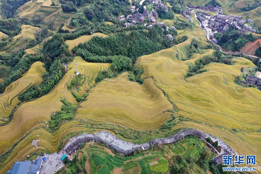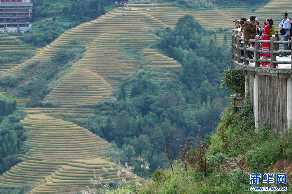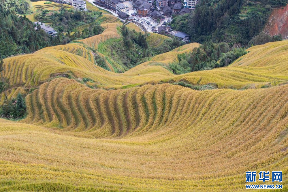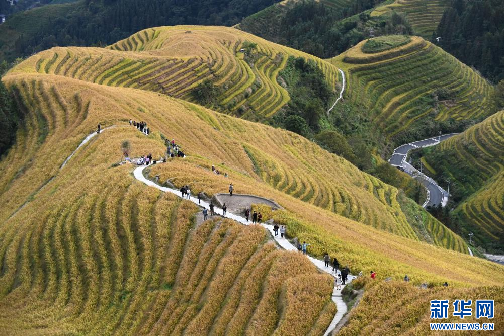 眼下,廣西龍勝各族自治縣龍脊梯田一片金黃,吸引大批游客前來游覽觀光。龍脊梯田已有2300多年歷史,是聯合國糧農組織認證的全球重要農業文化遺產。