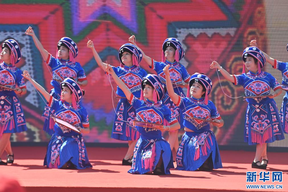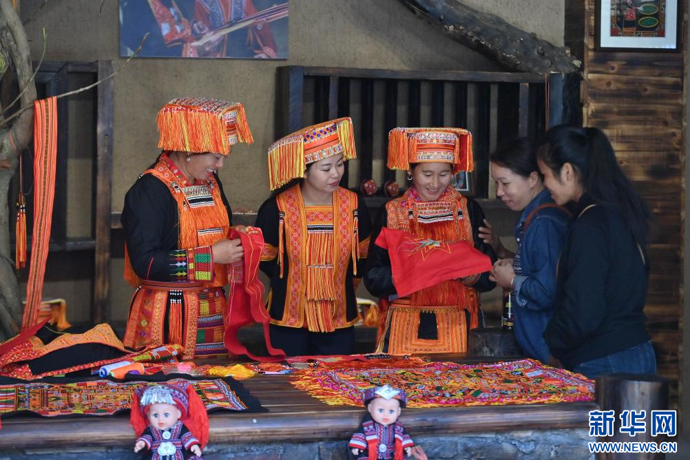 10月23日,演員在梧州市蒙山縣長坪瑤族鄉圖騰廣場展示瑤族刺繡。