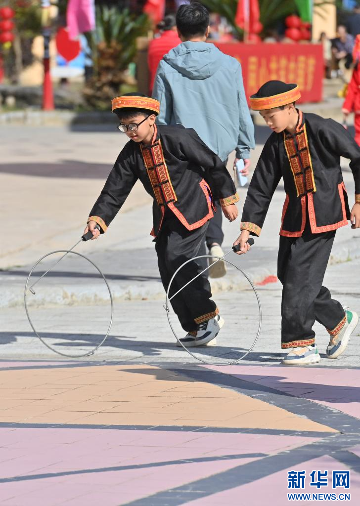 10月23日,瑤族少年在梧州市蒙山縣長坪瑤族鄉圖騰廣場滾鐵環。