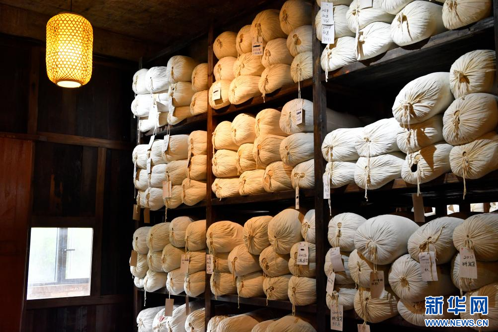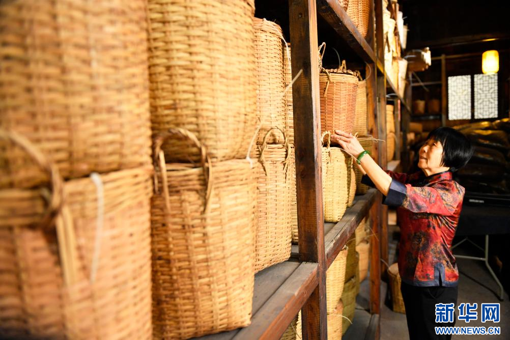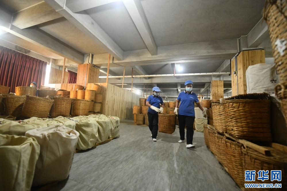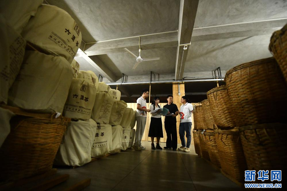 在梧州市蒼梧縣六堡鎮黑石山茶廠,六堡茶制作技藝國家級代表性傳承人韋潔群在查看茶葉陳化情況(5月17日攝)。