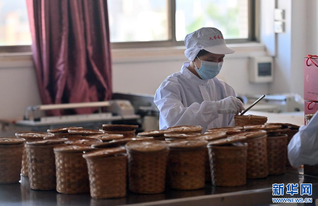 在梧州市天譽茶業有限公司,工人在包裝茶葉(10月8日攝)。