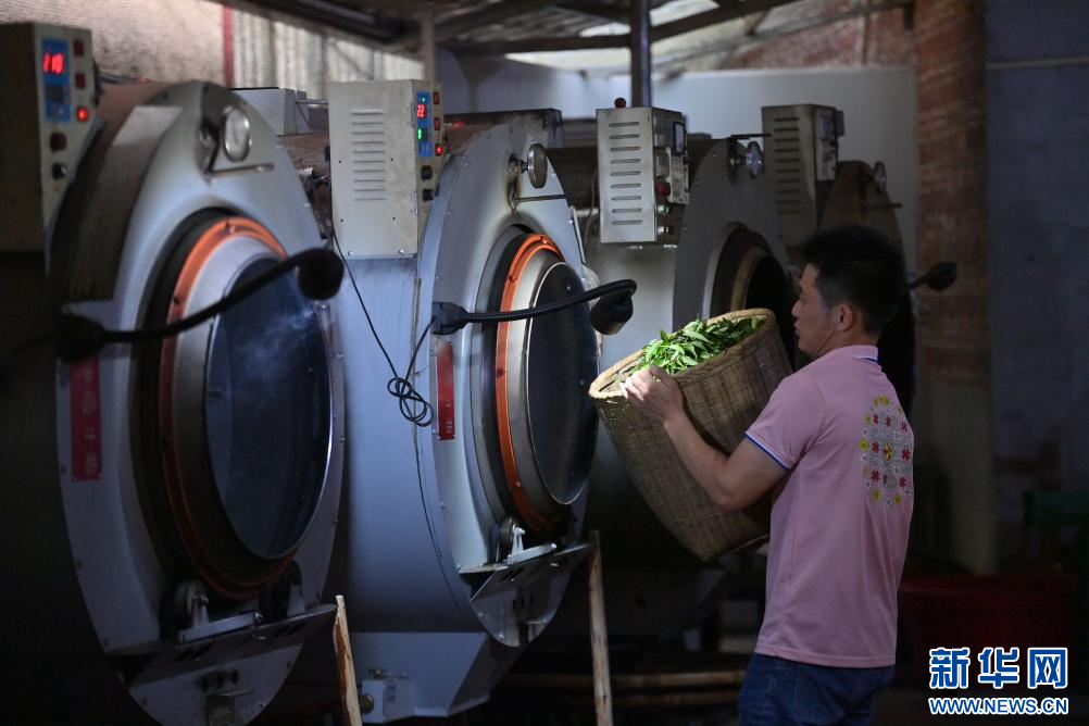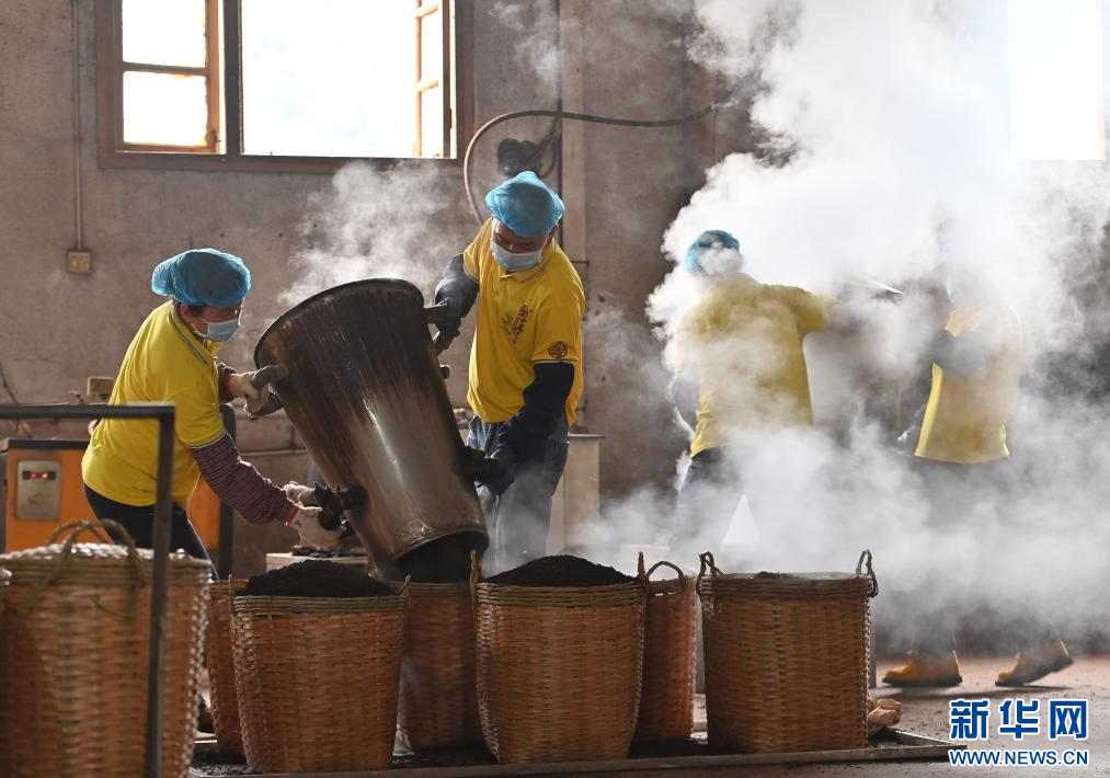 在梧州市蒼梧縣六堡鎮山坪村,村民在制茶(3月25日攝)。