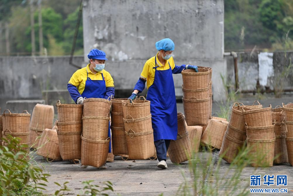 在梧州市中茗茶業有限公司,工人在搬運籮筐,準備裝茶葉(3月26日攝)。