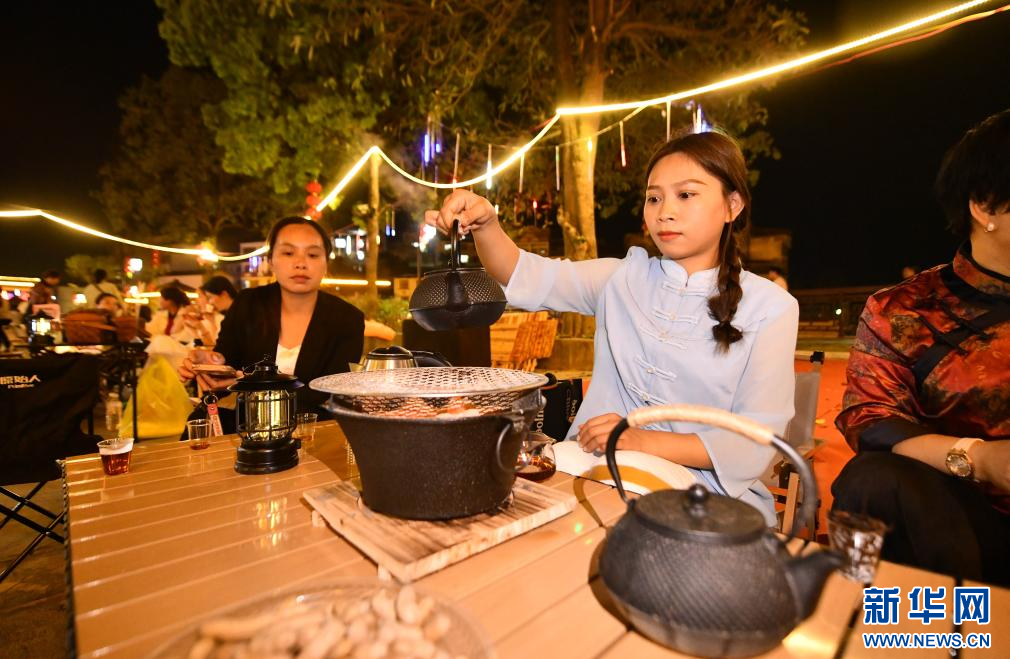 在梧州市蒼梧縣六堡鎮,游客和居民在街頭圍爐煮茶(3月25日攝)。
