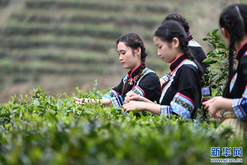 在梧州市蒼梧縣六堡鎮山坪村,大學生在體驗采茶(3月25日攝)。