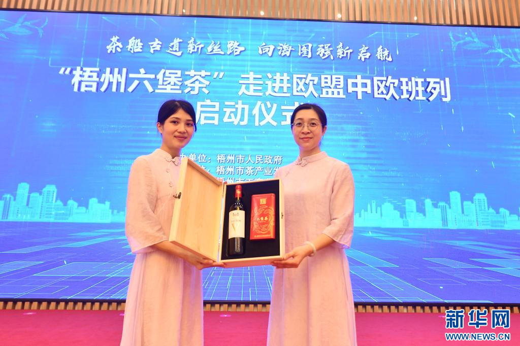 在梧州市“梧州六堡茶”走進歐盟中歐班列啟動儀式上,工作人員在展示六堡茶和法國紅酒產品(4月26日攝)。