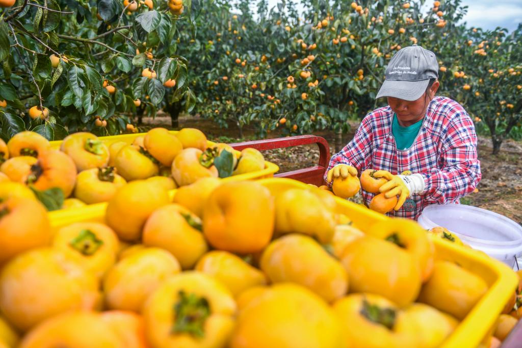 10月27日,在平樂縣二塘鎮牛角村,果農在收獲柿子。