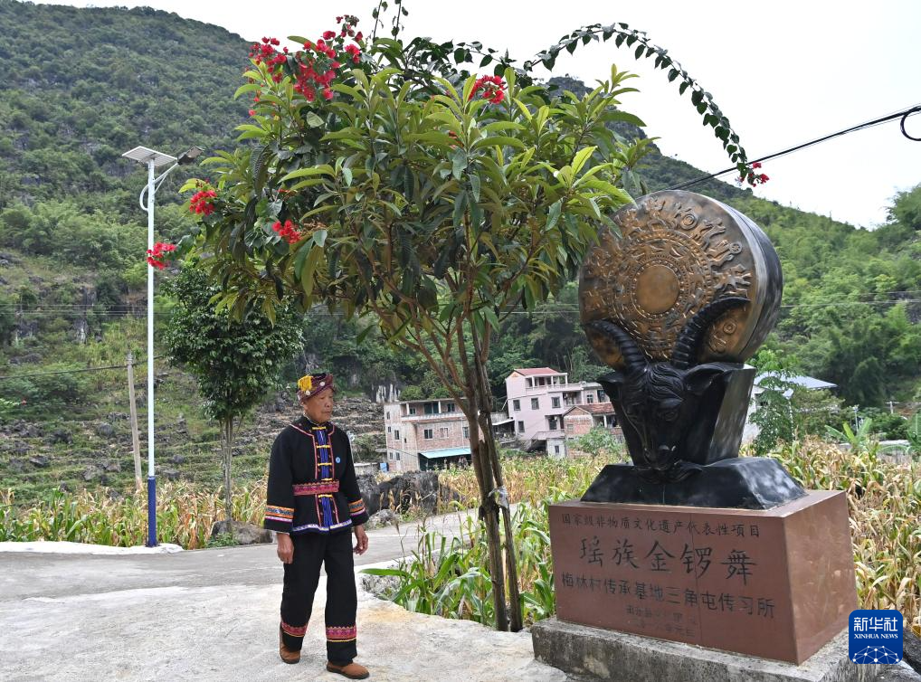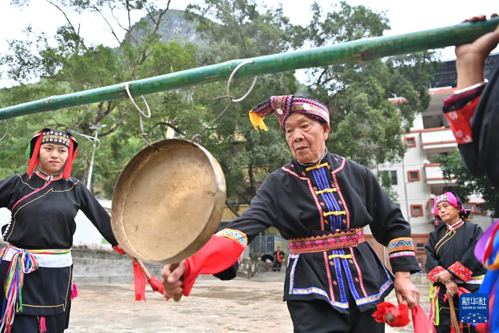 阮桂陸(右)和藝術團成員在田東縣作登瑤族鄉梅林村表演金鑼舞(10月28日攝)。