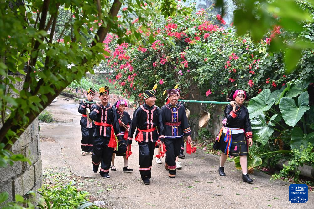 梅林村瑤族金鑼舞藝術團的成員行走在村道上,準備去排練(10月28日攝)。