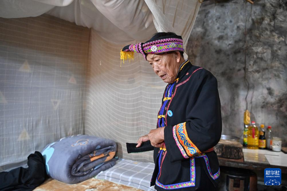 阮桂陸在田東縣作登瑤族鄉梅林村的家中換上民族服裝,準備表演(10月28日攝)。