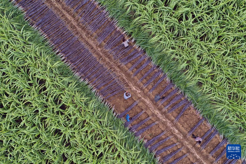 11月3日,在廣西柳州市柳江區百朋鎮里團村,村民在收果蔗(無人機照片)。